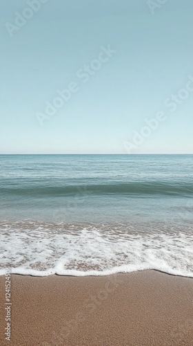 Serene ocean horizon with gentle waves meeting sandy shoreline under clear blue sky