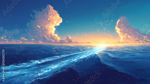 Serene ocean view with a wake trail leading to the horizon. Sapphire Ocean Depths. Illustration