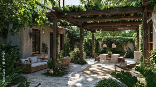 pergola, dining, area, greenery, lush, rustic, patio, garden, tranquil, plant, foliage, seating, arrangement, table, chair, sunlight, natural, lighting, lamp, landscaping, exterior, design, architecture, shade, relaxation, lifestyle, backyard, peaceful, serene, retreat, home, decor, furniture, wooden, structure, paver, stone, textured, building, facades, leaf, climbing, vine, intimate, setting, aesthetic, idylli, environment