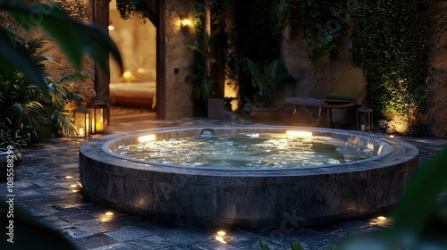 hot, tub, stone, tile, ambient, lighting, relaxation, nature, garden, leisure, tranquil, soothing, water, spa, warmth, retreat, luxury, peaceful, architecture, escape, wellness, comfort, evening, illumination, plant, cosy, setting, scenery, inviting, style, installation, serene, aesthetic, landscape, beauty, home, design, intimate, space, charming, decor, environment, bliss