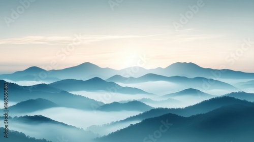 Serene Panoramic View of Misty Mountains at Dawn with Soft Light and Gentle Hues of Blue and Grey
