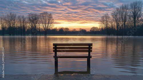 serene park bench sits nearly underwater, surrounded by tranquil water reflecting colorful sunset. scene evokes sense of solitude and calmness