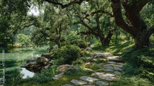 Serene Park Landscape Lush green trees tranquil lake stone pathway winding through foliage