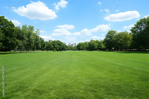 Serene park landscape with lush green grass, neatly lined trees, and a distant cityscape under a vibrant blue sky. Ideal for backgrounds, real estate, or nature themes.