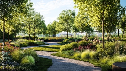 park, path, garden, tree, plant, flower, grass, green, nature, landscape, scenery, summer, sunlight, daylight, paseo, pathway, foliage, leaf, bush, shrub, meadow, blossom, bloom, environment, ecology, design, serenity, peaceful, tranquil, relaxation, calm, beauty, vibrant, fresh, lush, spring, autumn, stone, ground, trail, walk, stroll, vista, view