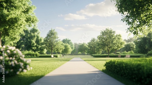 Serene park pathway, lush green trees and vibrant flowers lining a tranquil walkway, ideal for relaxation and leisure activities.