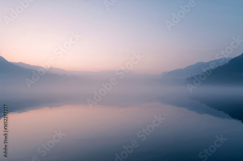 Serene pastel misty lake with foggy horizon soft pink blue reflections in calm water