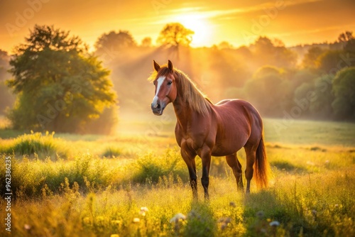 serene peaceful horse meadow idyllic countryside warm afternoon soft hazy light gentle earthy tones