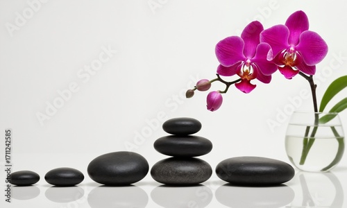 Serene pink orchid blooms above balanced dark stones, symbolizing tranquility, balance, and wellness.