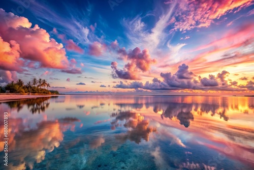 Serene pink sky mirrored on tranquil ocean waters, creating a breathtaking scene of natural beauty, evoking feelings of peace and relaxation, ideal for travel promotions.