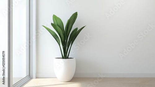 Serene Plant in White Pot - A vibrant green plant in a sleek white pot sits near a large window, adding a touch of nature to a minimalist interior.