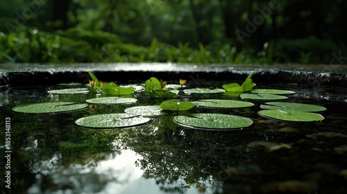 Serene pond scene features lily pads and small yellow flowers in tranquil water, surrounded by lush green foliage