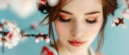 portrait, woman, cherry, blossom, make-up, blue, background, serene, beauty, closeup, flower, spring, nature, delicate, soft, flower petals, eyelash, peaceful, young, feminine, tranquil, floral, natural, fresh, elegant, gentle, calm, aesthetic, dreamy, seasonal, bloom, face, skin, cosmetic, eye, lip, coiffure, traditional, culture, japanese, springtime
