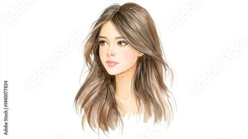 woman, portrait, watercolor, hair, brown, long, female, girl, young, face, beautiful, pretty, elegant, serene, calm, thoughtful, soft, lighting, delicate, artistic, illustration, painting, art, fashion, style, beauty, model, profile, side, shoulder, length, make-up, natural, eye, expression, gaze, head shot, closeup, white, background, colours, pastel, romantic, dreamy, feminine, gentle, subtile, digital