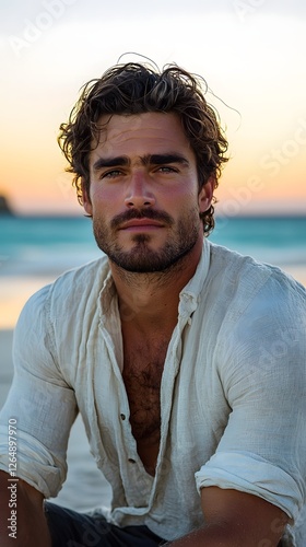 man, portrait, beach, ocean, sunset, linen, shirt, tranquil, serene, relaxed, sunny, skin, sand, nature, lifestyle, relaxation, summer, vacation, travel, male, masculine, rugged, photogenic, calm, peaceful, scenic, landscape, character, personality, model, adult, mature, guy, sunlight, dusk, dawn, coastline, shore, wave, water, horizon, warm, cosy, comfortable