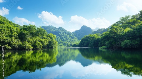 Serene Reflections: Tranquil Lake Surrounded by Lush Trees