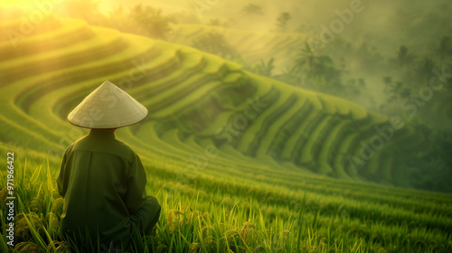 serene rice fields, early morning with mist gently rising from the ground. A farmer with hat tending to crops, the rows of rice plants perfectly aligned, creating a peaceful and picturesque scene