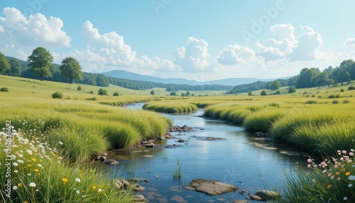 Serene River Flowing Through Lush Green Meadow Under Bright Sky