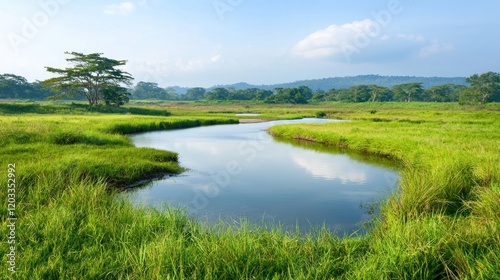 river, grass, green, landscape, nature, water, sky, tree, vegetation, peaceful, serene, calm, tranquil, scenic, rural, countryside, meadow, field, sunlit, bright, daytime, environment, ecology, wildlife, habitat, fresh water, flora, fauna, ecosystem, natural, beauty, unpolluted, clean, pure, clear, horizon, cloud, summer, spring, view, panorama, scenery, background, image, photo, photo