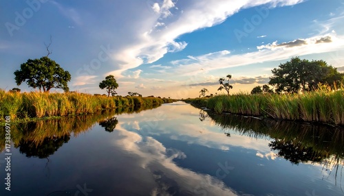 river, water, sky, cloud, nature, landscape, serene, tranquil, peaceful, outdoors, environment, green, tree, bank, vegetation, reed, grass, blue, white, sunset, sunrise, dusk, dawn, light, calm, clear, beautiful, scenic, idylli, wilderness, natural, untouched, pristine, horizon, open, wide, view, perspective, travel, destination, adventure, explore, journey, delta, wetland, waterway, grooved, stream