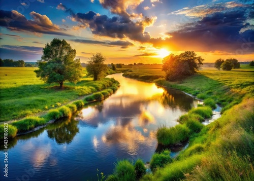 river, meadow, photo, flowing water, tree, shadow, cloud, water, scenic, picturesque, countryside, rural, environment, natural, contrast, image, photo, digital artwork, artwork, fine art, hi-res