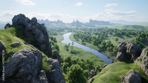 river, landscape, rock, hill, tree, meadow, vale, nature, scenery, view, outdoors, summer, daytime, sun, light, green, blue, brown, stone, grass, vegetation, environment, rural, calm, peaceful, serene, tranquil, idylli, beautiful, scenic, horizon, distant, city, town, building, structure, historical, ancient, mediaeval, fantasy, game, artwork, digital, art, illustration, design, background, texture, image