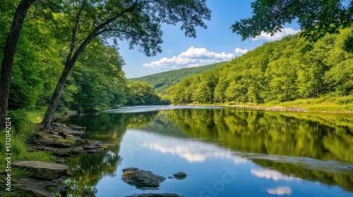Serene River Valley, Sunlight on Calm Water
