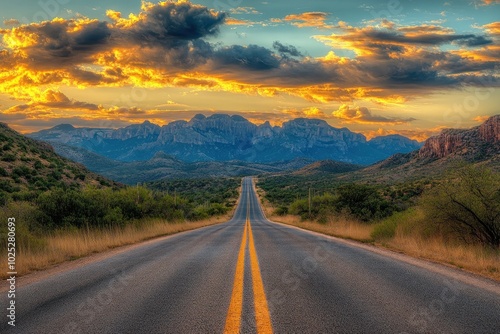 road, mountain, landscape, sunset, sky, cloud, horizon, nature, travel, scenery, pathway, wilderness, summer, adventure, highway, empty, beautiful, peaceful, blue, yellow, calm, environment, journey, scenic, view, terrain, tranquil, high-coloured, vibrant, sunshine, warmth, natural, exploration, direction, open, winding, distant, picturesque, earth, wild, remote, fresh, rural