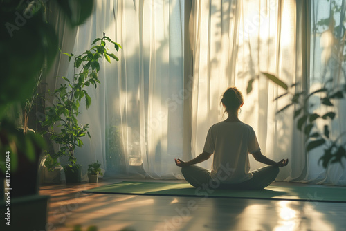 serene, room, soft, natural, lighting, closeup, woman, lotus, position, yoga, mat, eye, closed, mindfulness, meditation, peaceful, minimalistic, decor, green, plant, window, sheer, curtain, sunlight, calm, relaxing, atmosphere, warm, beige, tone, wellness, mental, health, harmony, balance, calmness, zen, background, wallpaper, day, indoor, simplicity, silhouette, meditating, relax, pose, sitting