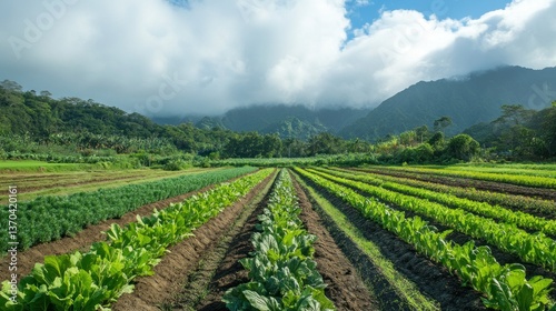Serene rows of cultivated crops in a lush field set against a mountain backdrop