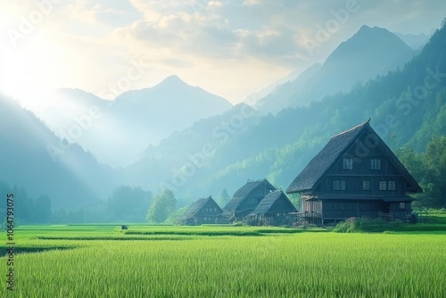 Serene rural landscape with traditional houses surrounded by lush green fields and mountains.