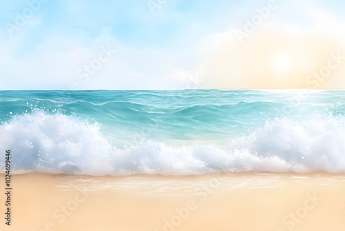 Serene Seascape with Crashing Waves and Sunlit Seafoam on Sandy Beach