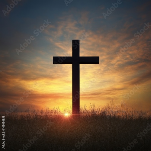 Serene Silhouette of Cross Against Dramatic Sunset Sky in Grassy Field Faith Hope Spirituality