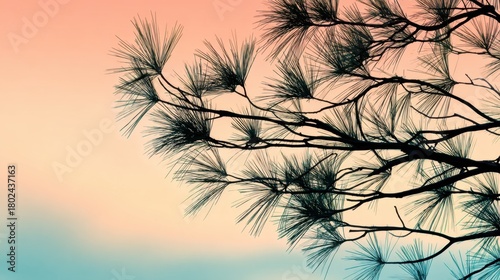 Serene silhouette of pine branches against a pastel sunset sky, evoking tranquility and nature's beauty