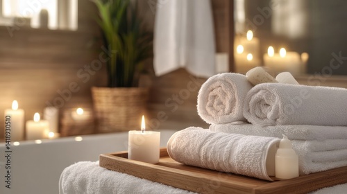towel, candle, bathroom, spa, relaxation, luxury, serenity, wellness, calm, calmness, comfort, hygiene, cleanliness, freshness, aromatherapy, ambience, warmth, peace, rest, softness, white, wooden, tray, soap, light, cosy, home, decor, interior, design, style, aesthetic, beauty, health, indulgence, therapy, treatment, product, comforting, inviting