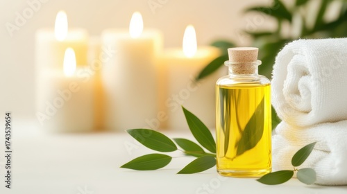 Serene Spa Still Life: A peaceful composition features a bottle of essential oil, lit candles and folded towels suggesting relaxation and wellness.
