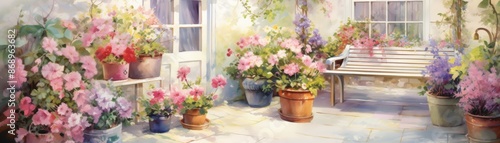 Serene Spring Oasis: Cozy Patio with Vibrant Potted Flowers in Watercolor Style