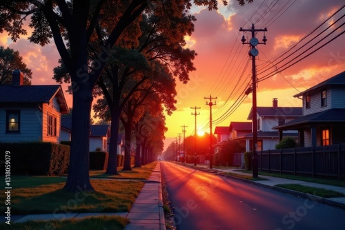 Serene Suburban Street at Sunset with Vibrant Hues and Tranquil Atmosphere