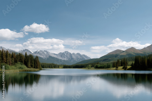 serene, summer, landscape, stunning, mountain, lake, alberta, surrounded, lush, greenery, towering, peak, sunlight, reflect, off, water, creating, scene, essence, nature, beauty, sky, brilliant, blue, fluffy, white, cloud, inviting, engulfed, tranquil, setting, texture, copy space, professional