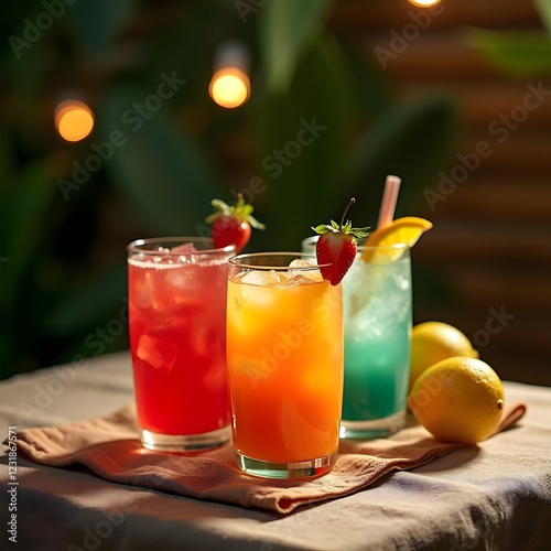 Serene Summer Sips Vibrant Drinks on Linen in Tropical Glow