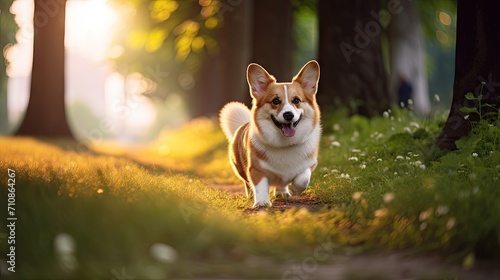 Serene summer stroll: A Pembroke Welsh Corgi enjoys a leisurely walk in a green park.