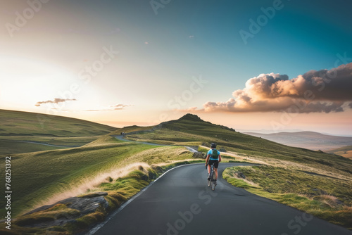 bicyclist, sunrise, scenic, adventure, road, cycling, landscape, serene, recreation, bike, morning, nature, travel, fitness, journey, leisure, activity, peaceful, solitude, health, exercise, panoramic, route, exploration, sport, golden hour, tranquil, countryside, lifestyle, hobby, endurance, environment, freedom, rolling hills, path, vista, beauty, escapism