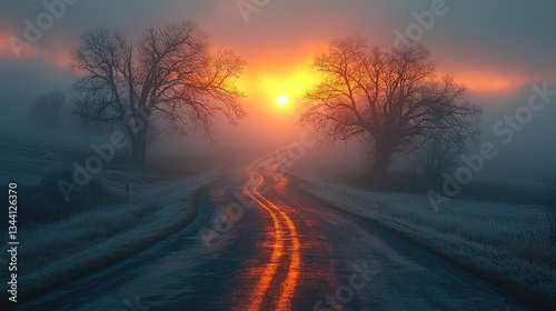 sunrise, fog, road, tree, winter, landscape, nature, light, morning, scenery, travel, beauty, peaceful, dawn, outdoors, horizon, calmness, scenic, calm, rural, atmospheric, weather, exploration, adventure, journey, picturesque, environment, twilight, gold, mist, vibrant, artistic, photo, visual, serene, colours, colourful, enchanting, captivating, idylli, breathtaking, stunning, aethereal, magical