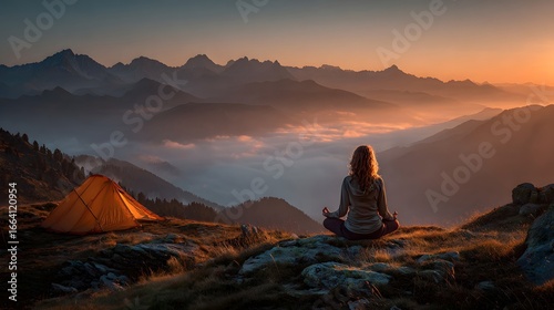 woman, meditating, lotus, pose, yoga, sunrise, sunset, mountain, mountain chain, peak, mist, fog, cloud, sky, orange, tent, campground, camping, nature, landscape, serene, peaceful, tranquil, calm, spiritual, mindfulness, meditation, relaxation, adventure, travel, journey, exploration, solitude, view, panorama, scenic, picturesque, golden hour, warm light, backlit, rocky, grass, alpine, majestic, huge, breathtaking, harmony