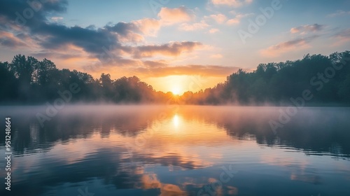 Serene Sunrise: Mist-Shrouded Lake Reflections