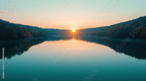 Serene sunrise over a calm lake surrounded by lush forests, reflecting vibrant colors and tranquility