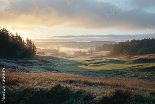sunrise, golf, course, fairway, green, landscape, nature, morning, fog, mist, cloud, sky, tree, grass, field, dune, hill, vale, scotland, autumn, winter, cold, frosty, dew, sunlight, gold, light, peaceful, serene, calm, tranquil, beautiful, scenic, picturesque, panoramic, recreation, sport, relaxation, travel, holiday, vacation, adventure, breathtaking, majestic, stunning, amazing