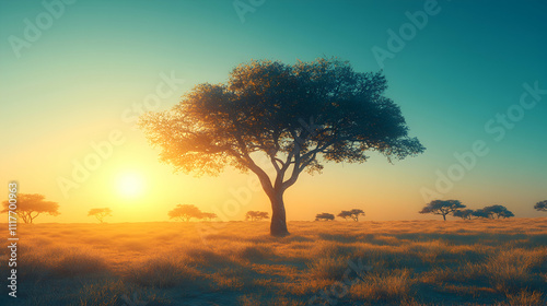 Serene sunrise over African savanna with lone acacia tree.