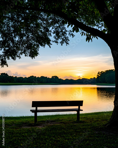Serene sunrise over calm lake, park bench under tree