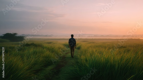 Serene Sunrise Over Lush Green Field with a Person Walking Alone